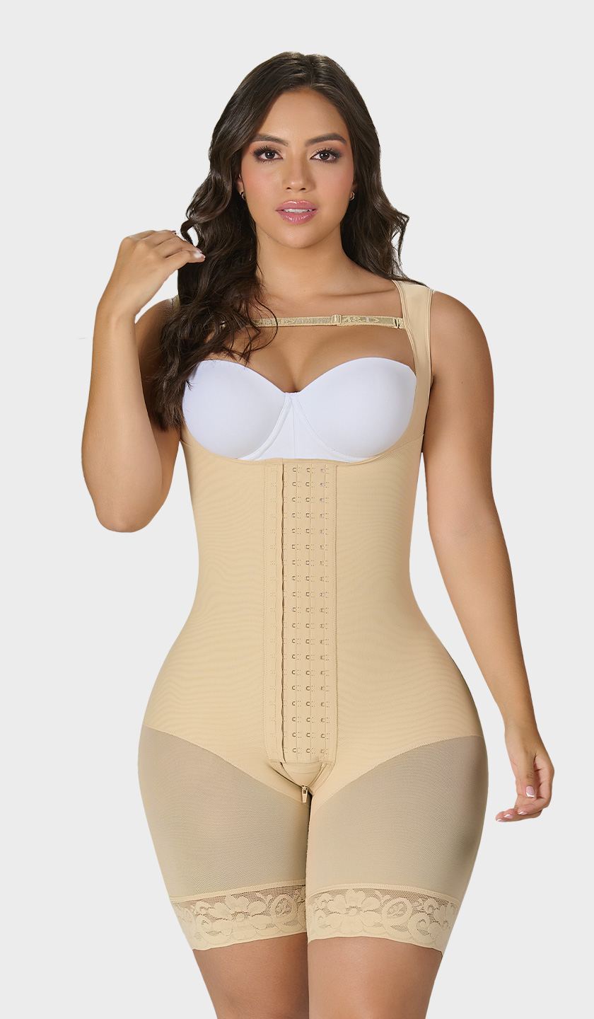 Nuestra faja reloj de arena® Ref. F00485, es una prenda media pierna de alta compresión, con 4 niveles de ganchos.