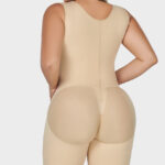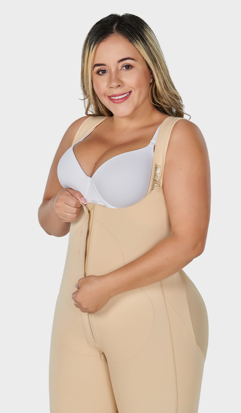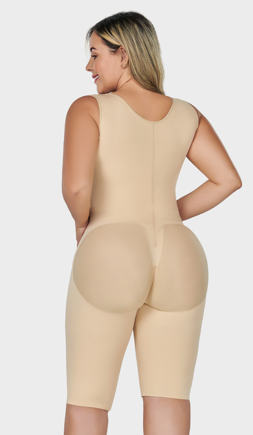 Faja larga con espalda y sisa cubierta, incluye tiras anchas, acolchadas y ajustables. Cuenta con refuerzo abdominal en forma de pera y ganchos con 2 niveles, cierre en la parte inferior que facilita el uso del baño y realce natural en glúteos con un diseño diferente, ya que cuenta con mayor capacidad en la zona de la cadera.